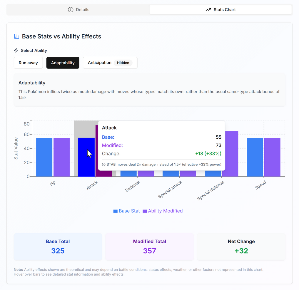 The Stats Chart tab contains an interactive bar chart that dynamically updates based on the Pokémon ability that the user selects: