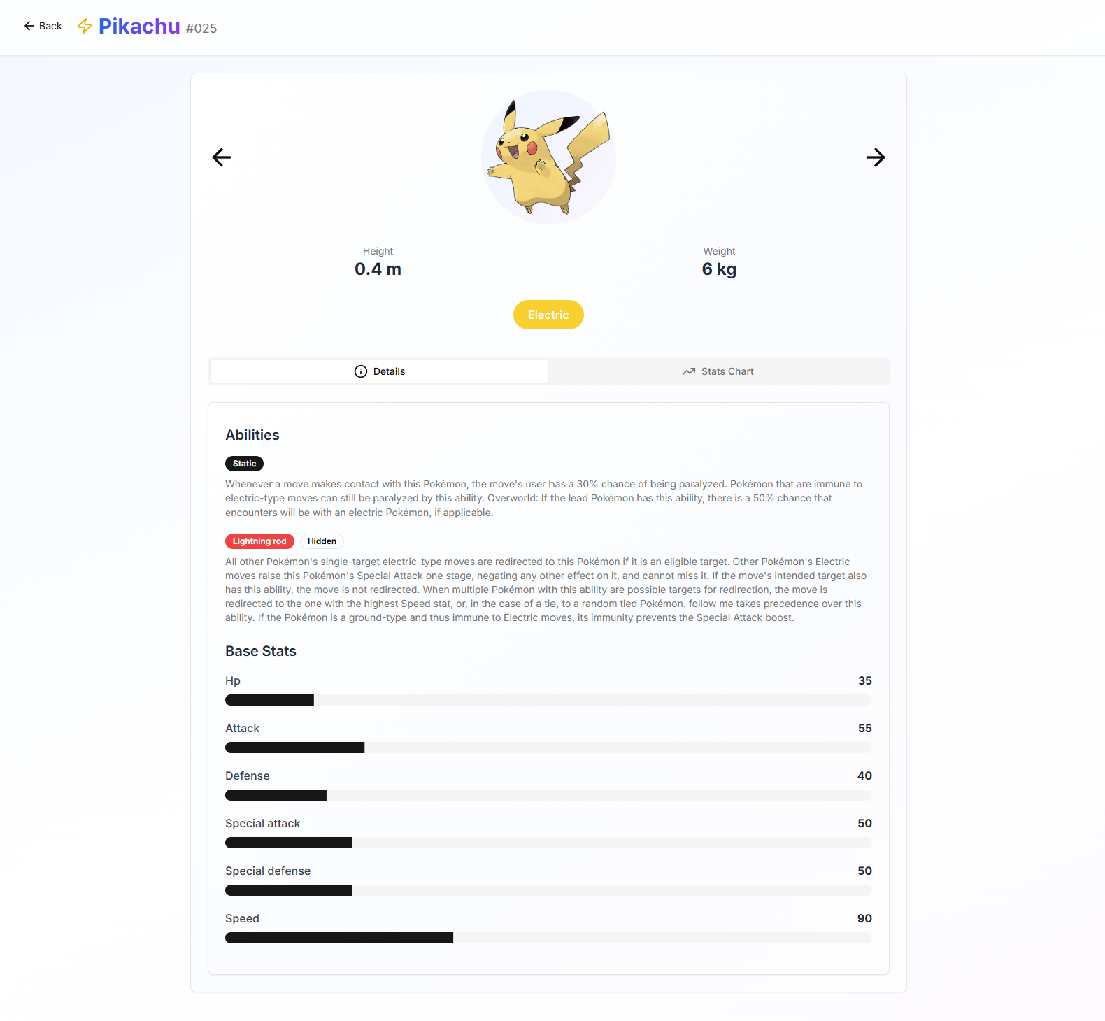 On the Pokémon info page, the user can view various details and use the left/right arrows to navigate to the previous/next Pokémon: